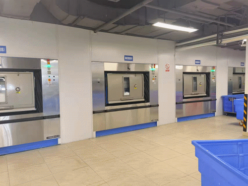 海獅目前為華西天府醫(yī)院配置了洗衣龍、衛(wèi)生隔離式洗滌脫水機(jī)、全自動(dòng)烘干機(jī)、四工位展布機(jī)、自動(dòng)熨平機(jī)&高速雙面燙平機(jī)、四輥熨平機(jī)、全自動(dòng)高速折疊機(jī)、堆碼機(jī)、烘干龍、純蒸汽發(fā)生器、脈動(dòng)真空滅菌器、純水制備系統(tǒng)等全套洗消設(shè)備。并確保所有設(shè)備嚴(yán)格按照 WST367-2012《醫(yī)療機(jī)構(gòu)消毒技術(shù)規(guī)范》、WS/T508《醫(yī)院醫(yī)用織物洗滌消毒技術(shù)規(guī)范》等標(biāo)準(zhǔn)規(guī)范的要求,設(shè)立“兩區(qū)三通道”(即潔凈區(qū)、臟污區(qū)、工作人員通道、醫(yī)用織物接收專用通道、醫(yī)用織物發(fā)放專用通道),做到工作流程由污到潔,不交叉、不逆行。并在潔凈區(qū)和污染區(qū)之間設(shè)置完全隔離屏障,實(shí)施負(fù)空氣壓阻斷,使?jié)嵨蹆蓞^(qū)之間實(shí)現(xiàn)雙通道的全封閉式實(shí)質(zhì)性隔斷,空氣不對(duì)流。